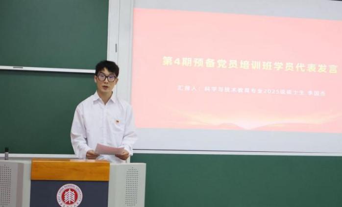 作为本期培训班学员代表,国际与比较教育研究所科学与技术教育专业2025级硕士生李国杰同学在发言中倡议同学们于理论滋养中坚定前行方向,在时代变革中彰显专业担当,在实践淬炼中践行入党初心,将入党誓词转化为服务人民的具体行动,用青春和智慧书写属于自己的精彩答卷。
