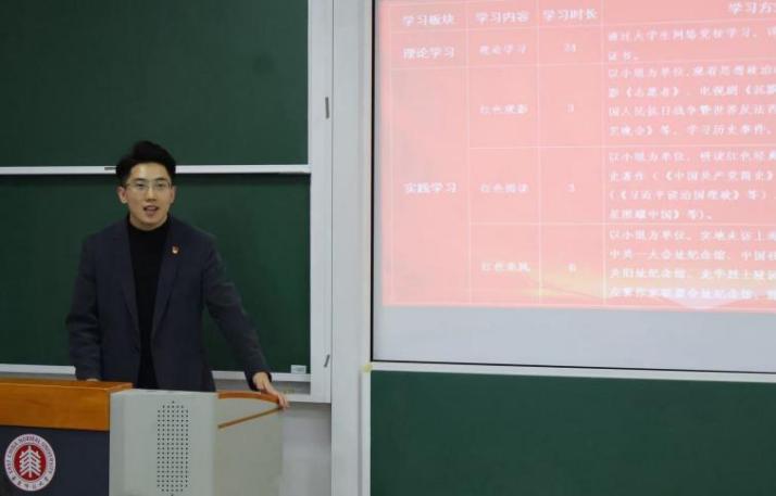 教育学部学生党建中心指导教师胡航老师详细介绍了本期培训班的培训目标、课程体系、教学方式与考核标准。他寄语同学们沉下心来认真学习、专心思考,主动分享、积极交流,坚持学思践悟、知行合一,在理论学习中明确初心、在实践行动中践行使命,打好提高党性的组合拳。