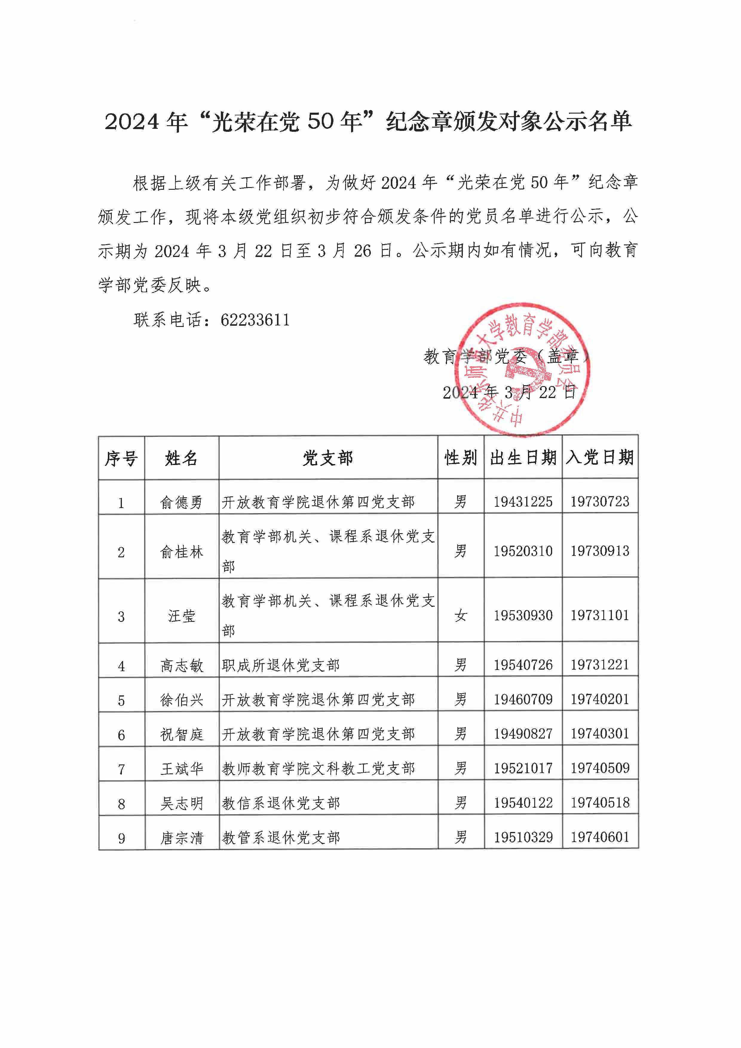 【公示】教育学部2024年“光荣在党50年”纪念章颁发对象公示名单