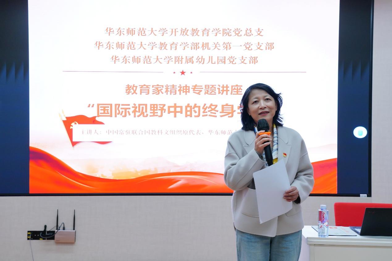 4月2日,开放教育学院党总支联合教育学部机关第一党支部、附属幼儿园党支部开展联合主题党日活动,特邀中国常驻联合国教科文组织原代表、我校兼职教授杨进作“国际社会终身学习发展趋势”专题讲座。活动以“教育家精神”为引领,聚焦终身学习理念创新与实践路径,为跨领域党建合作注入新动能。开放教育学院党总支书记赵健主持,80余名党员及教职工聆听了报告。