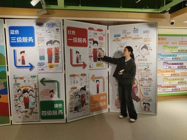 工作人员首先为志愿者上了一课,详细介绍了曹家村独特的"微格分色"管理法:红色一级服务、黄色二级服务、蓝色三级服务、绿色四级服务,不同颜色对应不同服务需求,精准又高效。