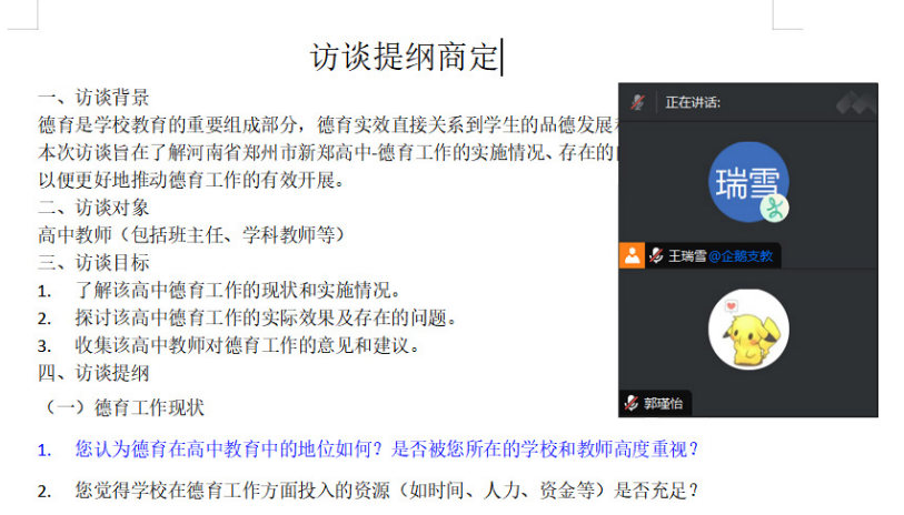 为深入探究河南省新郑高级中学的德育实施现状,项目拟通过对教师、学生的访谈和问卷调查分析该校的德育建设现状,并提出改进建议。当前,项目已完成访谈提纲与问卷的设计,并通过对一位成熟班主任的深入访谈,初步了解到该校在德育课程方面取得的成就、在评价体系和实施路径方面存在的单一化和扁平化问题等。项目预期形成一份德育工作优化方案,为该校改进德育工作提供新思路。