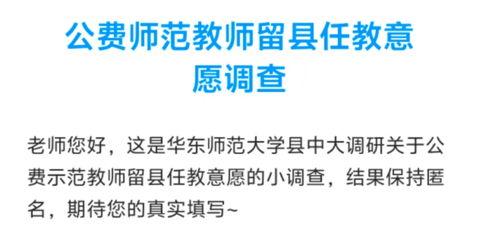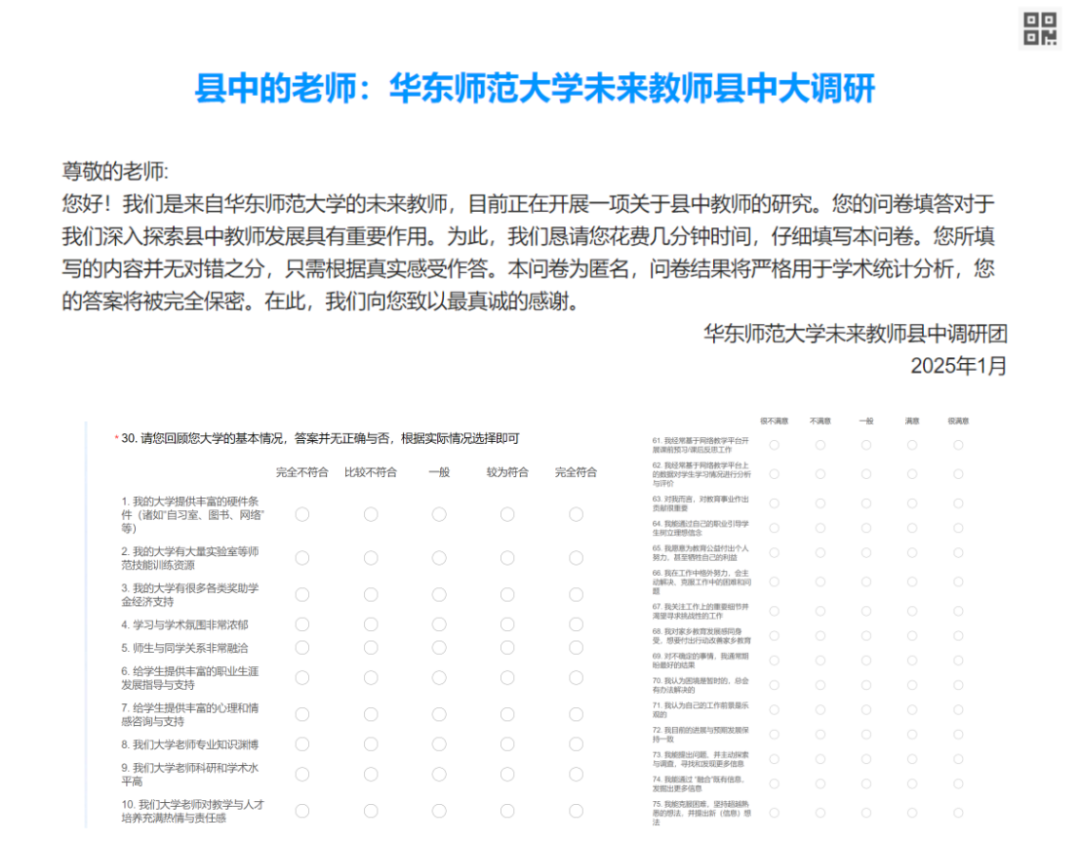 本项目旨在了解重庆市秀山高级中学公费师范教师的留任意愿及其影响因素。目前,项目已完成问卷发放工作,回收率达85%以上。初步数据估计影响教师留任的主要因素有职业发展空间、生活条件改善及政策支持力度等。年后将开展质性访谈,聚焦不同意愿教师的心路历程与职业故事,以及校领导对公费师范生综合表现的评价,为优化教育资源配置提供参考。项目将通过研究报告与宣传材料展示调研成果,为提高公众对乡村教育的关注、推动乡村教育可持续发展提供支持。