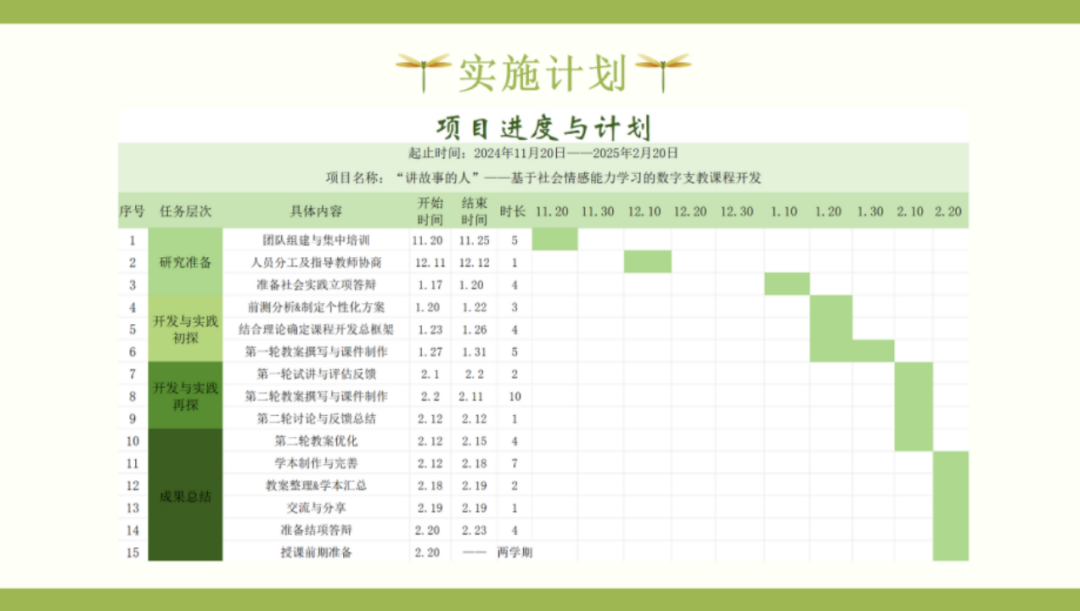 本项目旨在开发一套全新的围绕社会情感能力(SEL)五个维度的校本课程,鼓励孩子们以语言为媒介对世界进行探索,并逐步培养学生的表达能力以及表达自信心,让孩子们在故事讲述中,见天地、见众生、见自己。基于前期扎实的准备,团队针对授课班级学生特点,进行了第一轮课程教案撰写以及课件的制作,基本完成了项目初探阶段。后期团队将针对性地对第一轮活动进行经验总结,进而展开第二轮课程教案及课件的制作,为实践提供更为科学可行的施教方案。