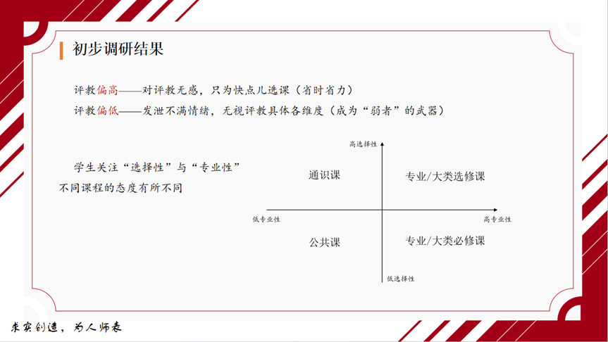 本项目旨在探究华东师范大学学生评教偏差,进而为学生评教系统改进提出合理建议。经过前期文献梳理发现,该项目需深入华东师范大学各学院/部,通过访谈了解评教逻辑并分析偏差类型及形成原因以总结提出改进意见。目前已完成多所院系的访谈,初步发现学生评教时会出现为尽早完成评教而全部选择A等、学生评教成为“报复”的出口等非理性偏差现状,接下来,团队将进一步调研分析形成偏差分析及优化建议报告。