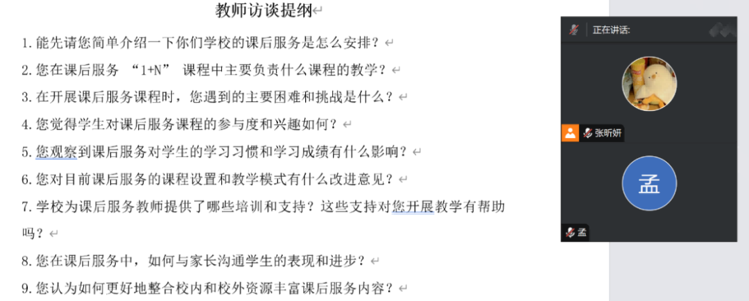 这是我第一次比较正式地访谈幼儿园一线教师,他们虽然来自不同的城市有着不同的经历,但是对“一对一倾听”工作都抱有极大的热情。在他们讲述的过程中,虽然隔着屏幕,但我也能感受到他们对于提升倾听质量和能力的渴望。教师们真诚的话语让我更加明确了方向,并且更加有信心将项目进行下去。