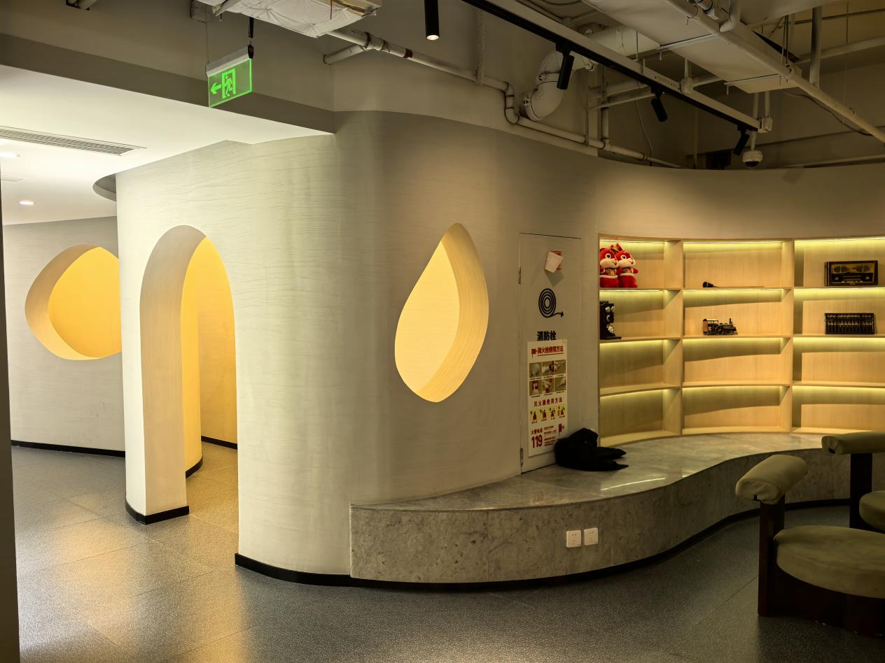 退休教师们参观了社区核心公共配套“谷村落”。这一地下多功能空间融合阅读、手工、绘画等功能,以弧形片墙分隔区域,营造出自由流动的社交场景。其中,“哲思空间”采用卵型封闭设计,为内向长者提供静谧独处环境;下沉式庭院则模拟乡村菜园,让老人亲近自然。此外,社区内健身房、电影院、图书馆、自助厨房等设施,以及适老化细节设计(如全屋地暖、智能安防系统、无障碍移门等),展现了硬件服务的周全。