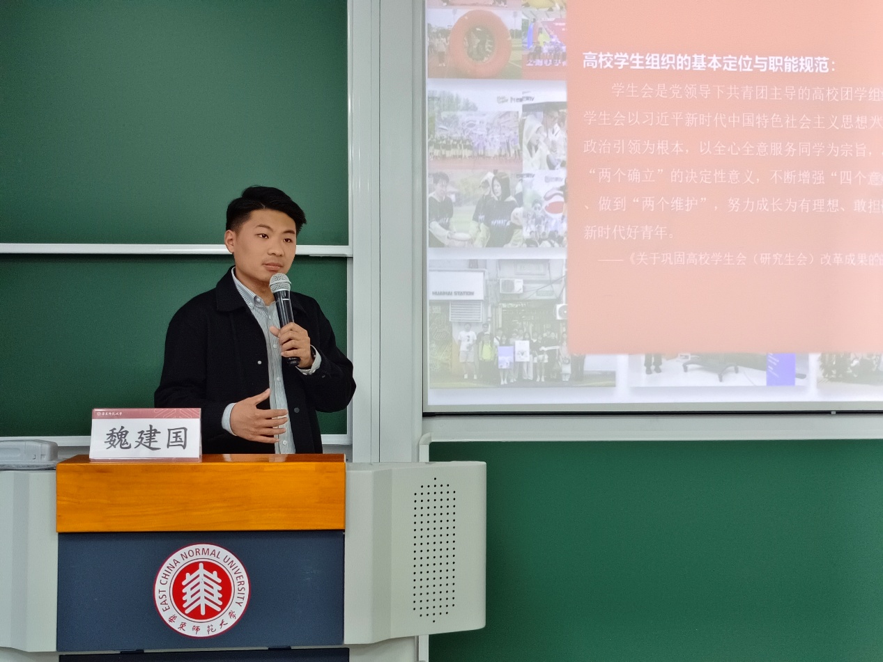 魏建国同学以“研究生会组织建设的工作经验”为主题,进行了精彩的分享。他从深入学习贯彻习近平新时代中国特色社会主义思想入手,详细介绍了研究生会在政治引领、价值倡导、学习成长、实际困难解决以及组织改革等方面的具体工作。魏建国同学强调,研究生会要积极践行“全心全意为同学服务”的工作宗旨,在重点领域干实事、出实招、求实效、谋实功。他通过一系列生动的案例,展示了研究生会如何引领全校研究生把握时代脉搏,挺膺担当作为,真正成为广大研究生的温暖家园。他的分享不仅为同学们提供了宝贵的经验借鉴,也激发了大家对团学组织建设的深入思考。