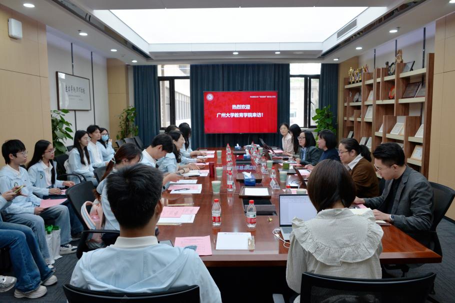 广州大学教育学院党委副书记胡艳芝、教师张怡、学工办主任张方超、辅导员李倩,以及12名教育学类专业学生来访交流,华东师范大学教育学部党委副书记沈晔、教学事务部副主任邵晓虹、学生事务部副主任柳叶、专职辅导员胡航、团委书记王垚、助理辅导员梁梦婷及6名团学骨干参加,会议由学生事务部副主任柳叶主持。