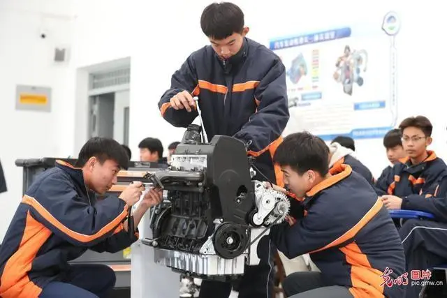 河北省石家庄市井陉县职业技术教育中心,学生进行汽车发动机拆解实训。王保龙摄/光明图片