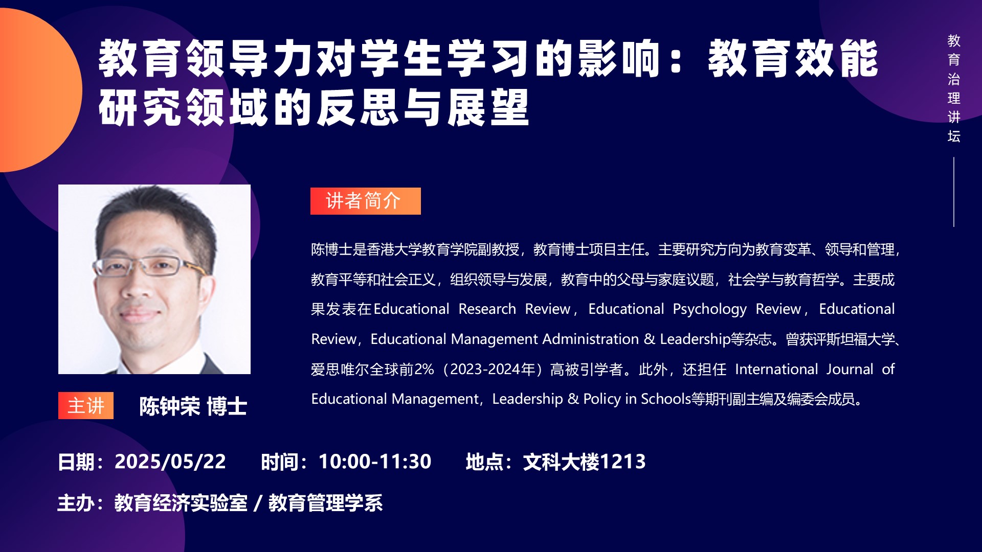 陈钟荣 博士:教育领导力对学生学习的影响:教育效能研究领域的反思与展望