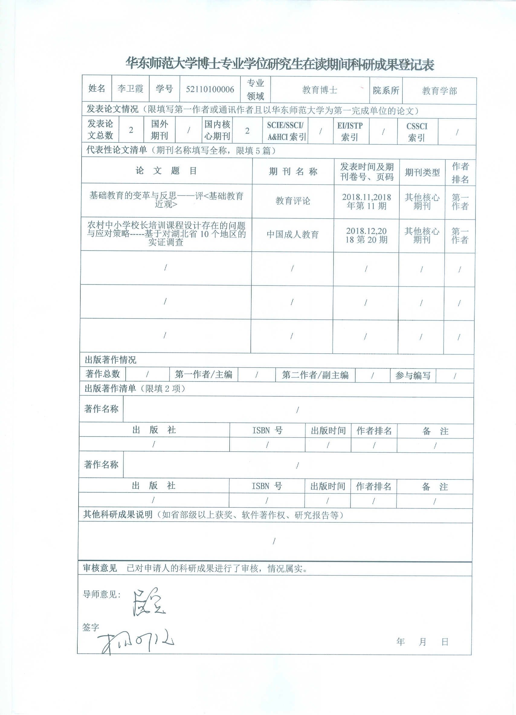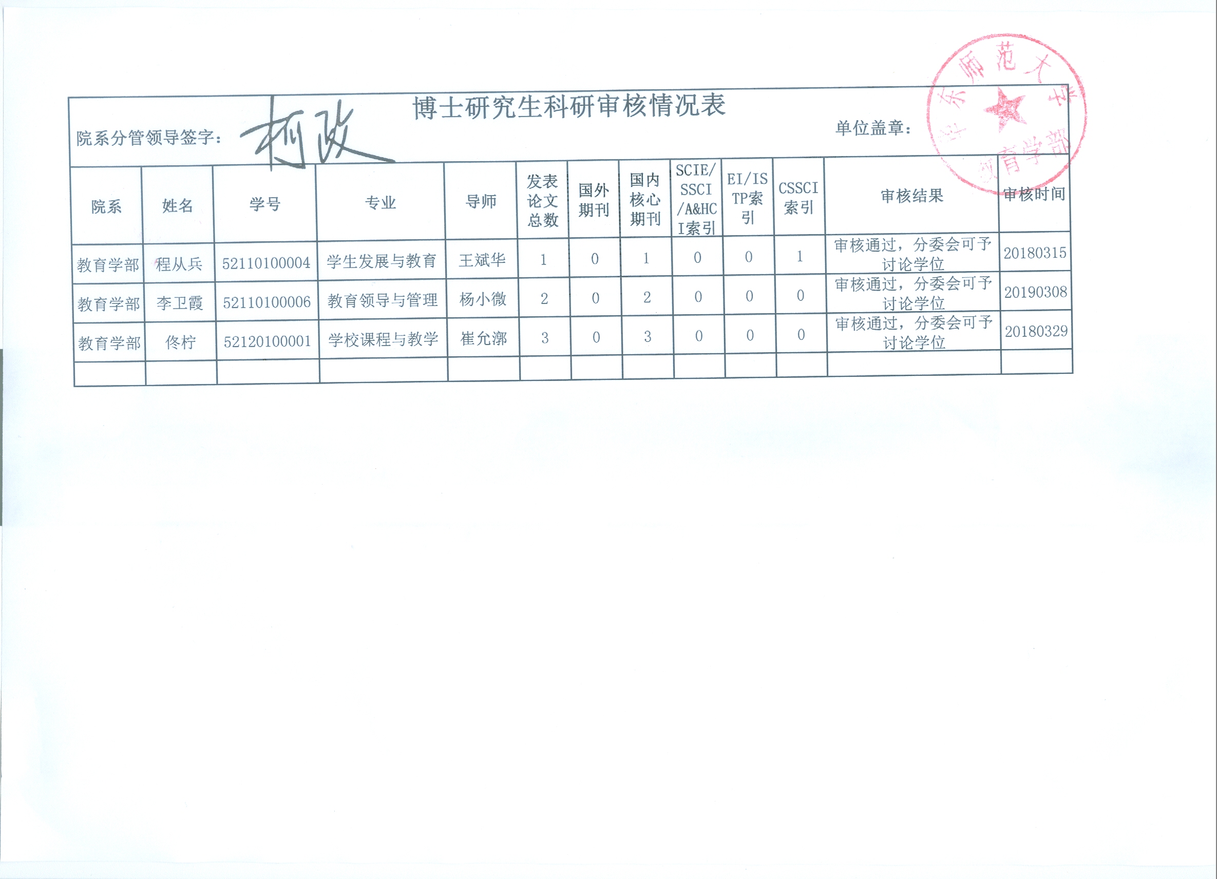 根据华东师范大学研究生院关于教育博士研究生科研成果发表要求的相关规定,教育学部对2019年春季拟毕业教育博士研究生的科研情况进行审核,现将复核结果予以公示。公示期自2019年4月26日至5月3日,在此期间如有异议,请与教育学部教学事务部办公室联系。联系人:李老师。联系电话:62232614。