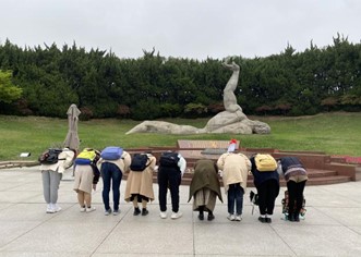 邱兰欢:参观烈士陵园的过程令我印象深刻的是,在献礼仪式中,有两位带着军绿色的帽子的老爷爷,站在人群的后面,严肃又挺拔地站着,在鞠躬前缓慢取下帽子,仪式结束后又认真带上帽子。无法获知他们背后有着怎样的故事,但是他们那顶天立地的造形不由自主让人联想到革命先烈的光辉形象,令人感动,不禁动容。