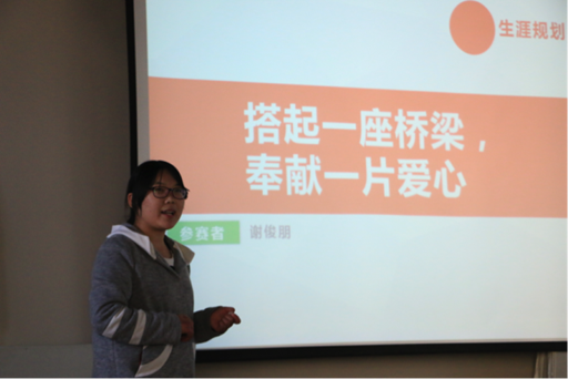 首先上场的是来自16级学前教育学系本科的蔡姮玲同学。她从自身各方面进行环境分析,整理自己的就业规划情况,并列出了生涯规划中的机遇与挑战。