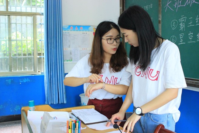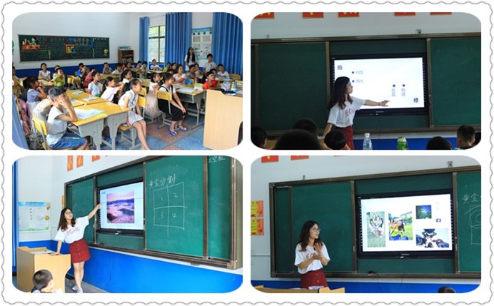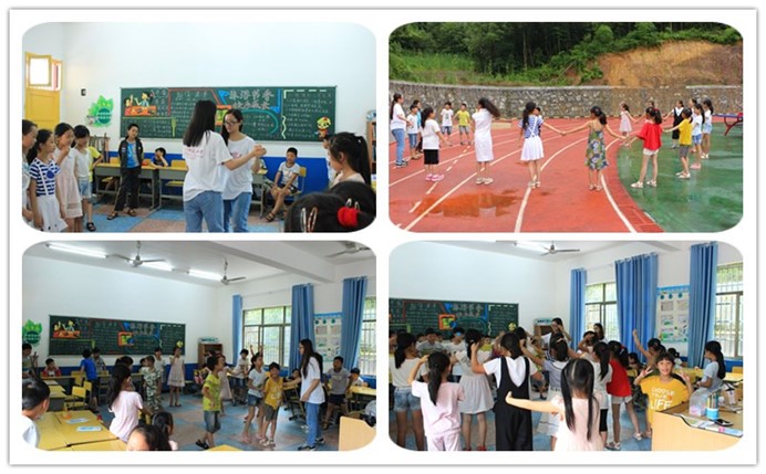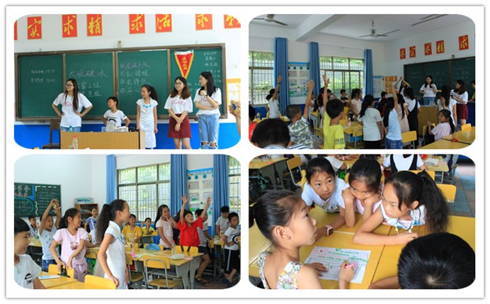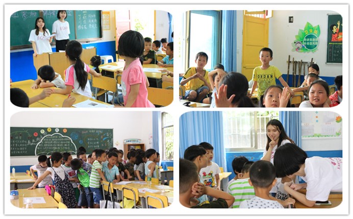 短暂休憩之后,支教队成员分为两个小组,分别与大班、小班的学生进行自我介绍,开始相互熟悉。大班班主任、高教所2015级硕士吴君,小班班主任、学前教育系2014级本科生罗莎莎分别带领两个班开始破冰之旅。通过随机抽颜色纸条的方式,让营员们随机组成小组。选组长、起组名、定口号、画组徽,制定班级公约,以小组为单位互动介绍,组织开展”领导人”、”踩报纸”等破冰游戏。孩子们玩得不亦乐乎,迅速打成一片,让来自多个学校、不同年级的同学们逐渐凝聚成为一个团体。随后,班主任为各自班级学生介绍了后续的课程安排,做好课前预热工作。