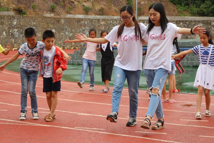 学前教育系2015级本科志愿者陶怡玮教授”双人舞蹈”课。课上,她向同学们展示了法国双人舞蹈的基本手势,为孩子逐个指导纠正,进而开始舞蹈动作的分解教学。孩子们认真学习这种新颖的舞蹈形式,并主动与老师沟通练习,班级氛围热情高涨。志愿者罗莎莎在”音乐”课上,教授孩子们以合唱的方式,学习歌曲《幸福的孩子爱唱歌》。活泼的歌曲旋律,分组练习的有效方式,让每一个同学都得到了很好的展示机会。歌曲尽管有些难度,但经过同学们认真努力的练习还是初见成效。下午4点,夏令营第一天的课程全部结束。