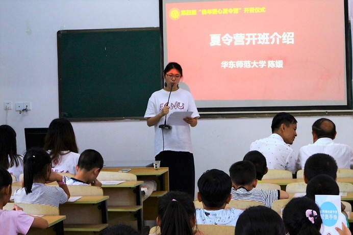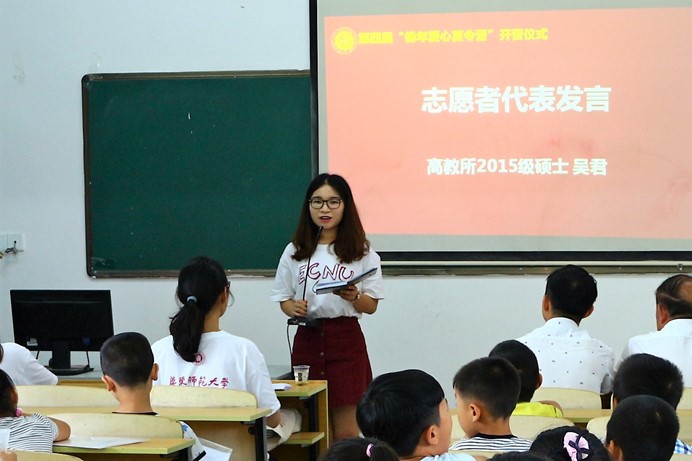 紧接着,志愿者代表、高等教育研究所研二学生吴君发言。吴君将此次支教称为一次圆梦之旅,热切表达了自己对支教活动的期待。她表示自己很幸运能在研究生的最后一年赶上支教机会,也会十分珍惜这次宝贵的机会。作为支教队队长,她也对夏令营课程进行了详细的解读。她表示,期望与营员们建立友好长久的联系,希望这段时间能让孩子们获得多一点快乐,多一些成长。