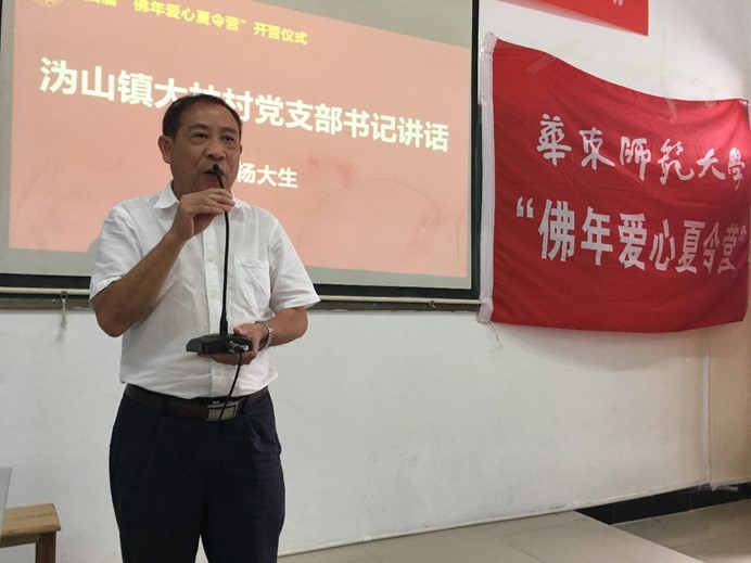 开营仪式的最后,由大林村党支部杨大生书记发表讲话。杨书记表示,他感受到了华东师大对醴陵市大林村,尤其是佛年学校无微不至的厚爱,感谢志愿者团队的到来,也鼓励同学们要认真读书、立志成才。至此,第四届”佛年爱心夏令营”开营仪式圆满落幕。