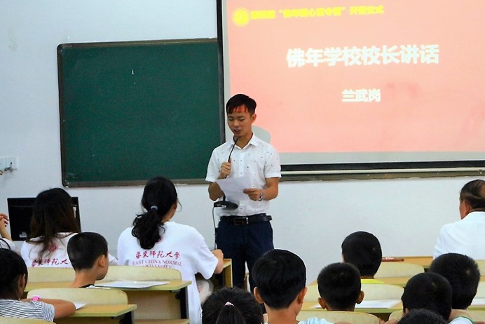 开营仪式伊始,佛年学校兰武岗校长致欢迎辞。兰校长热情洋溢地向参加开营仪式的各方人员表示了衷心的感谢。他表示,”佛年爱心夏令营”搭起了华东师范大学与大林村之间的情感桥梁,也感谢华师大对学校的大力关注和支持。夏令营已走到了第四个年头,营员们在夏令营活动中开阔了视野,提高了综合素质。他特别提到,今年升入市重点中学的四名学生,均曾是历届夏令营的营员。同时,兰校长感谢大林村村委对夏令营全方位的支持,感谢所有为佛年爱心夏令营而努力的人,并希望在座的营员们能够珍惜机会,努力学习。