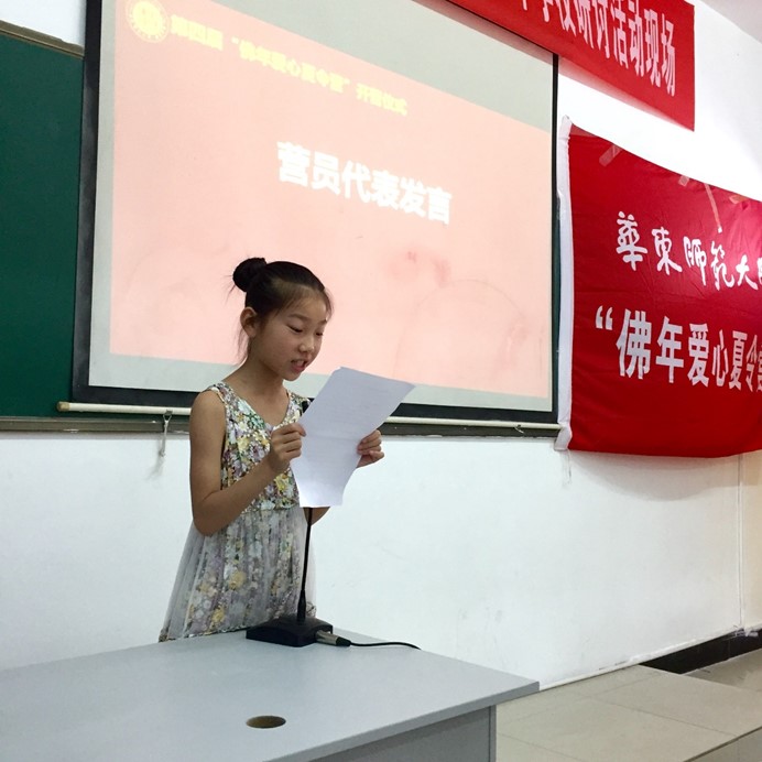 就读于佛年学校五年级,已连续参加两届夏令营的刘同学,作为营员代表上台发言。她首先表达了对于志愿者团队的感谢之情。她表示,佛年爱心夏令营对于她们学生而言,既是一次增长知识、开拓视野、磨练意志的好机会,也是一个学习团结协作的好途径,更是一个提高自身素质的好形式。她表示,会好好利用这个机会,认真向志愿者老师们学习,在学习中体会快乐与成长。