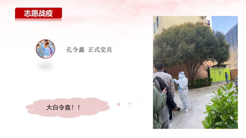 这场疫情攻坚战中,党员同志们先锋模范作用凸显,校园志愿服务常态化。梁雨是中北校区3舍的一名志愿者,她参与抗原试剂分发、餐食物资搬运等工作,能够为同学们服务让她非常快乐。孔令鑫住在校外同普路宿舍,她主动担任水果团团长、分发快递与餐食、核酸检测秩序引导,以自身行动号召:“吾辈当自强,当党和人民需要我们的时候,我们党员一定要冲锋在前!”留校驻守的教职工们也在一线默默奉献,比如驻守中北校区10余天、白玉路宿舍20余天的蒋瑾老师,她在会上表示,领导们十分关心同学们的状态,欢迎同学们向学院和学校提建议。
