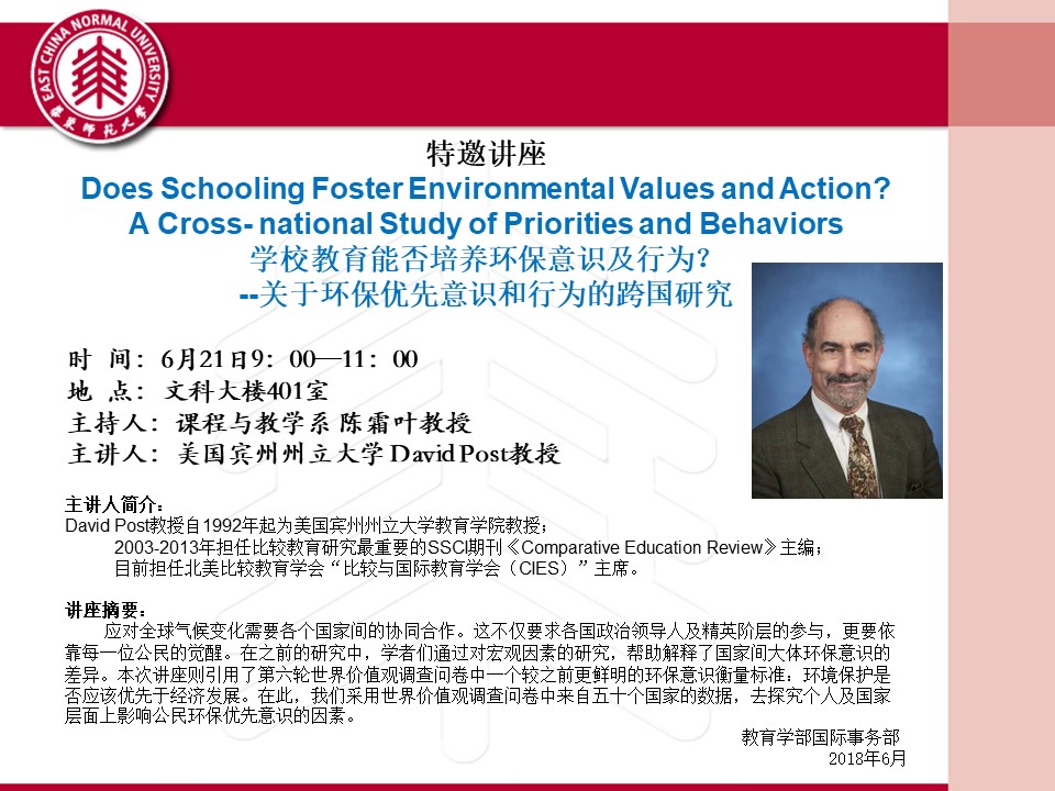 David Post教授:Does Schooling Foster Environmental Values and Action? A Cross- national Study of Priorities and Behaviors