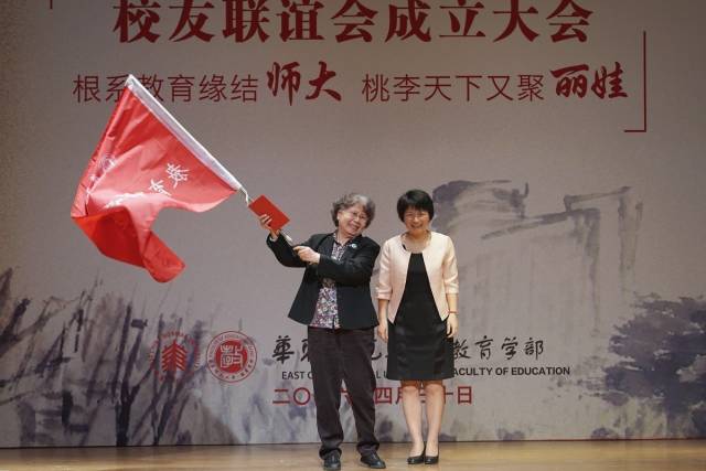 副校长梅兵为教育学部校友联谊会首任会长叶澜教授颁发聘书并授旗