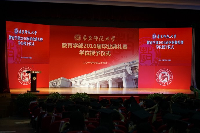 在全场肃穆奏唱国歌之后,华东师范大学教育学部2016届毕业典礼正式拉开序幕。华东师范大学教育学部主任袁振国教授,教育学部党委书记汪海萍教授,校友代表、上海工艺美术职业学院党委书记许涛学长,教育学部学术委员会主任委员陈玉琨教授,教育学部党委副书记万明霞老师,教育学部副主任黄瑾教授,教育学部副主任代蕊华教授,教育学部副主任李政涛教授、教育学部各事务部主任、各系所领导及教师代表等60余人出席了本次毕业典礼。典礼由教育学部党委副书记韩春红老师主持。