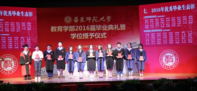 2016年,教育学部共有43名同学获得上海市优秀毕业生荣誉称号,48名同学获得华东师范大学优秀毕业生荣誉称号。毕业典礼上,教育学部党委书记汪海萍教授为12名分别来自教育学部各系所的优秀毕业生代表颁发荣誉证书。临别之际,他们也代表2016届全体毕业生感谢教育学部的老师们对自己的谆谆教诲和殷切嘱托,并表示作为教育学子,必将带着感恩的心,不忘初衷,砥砺前行。