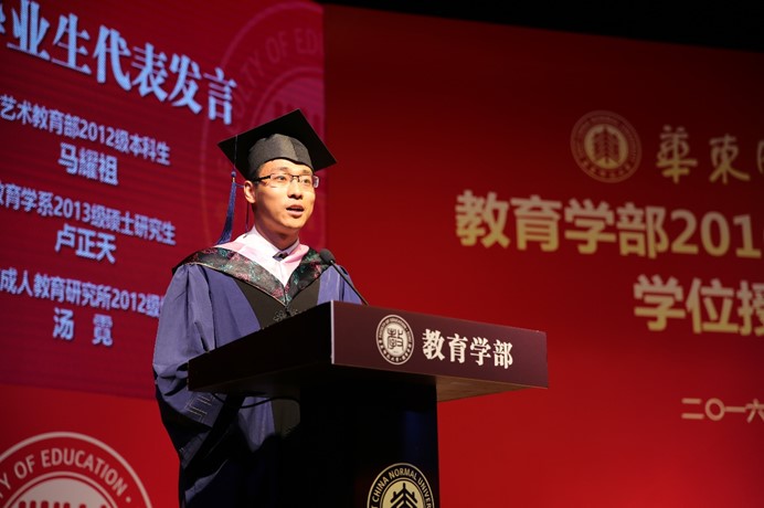 曾任校学生会副主席,毕业后作为研究生支教团团长赴云南楚雄支教,艺术教育部2012级本科生马耀祖同学动情地回忆了自己四年来的成长经历:”我很庆幸自己能够来到华东师范大学这个充满书香气息的中国远东最美大学,遇见最美的老师,遇见最美的同学。今天我们毕业了,告别了曾经的懵懂无知,告别了曾经的年少轻狂。但我相信哪怕毕业了,在以后的人生中,我们依然会保有真诚直率的目光,依然会涌动奔流激荡的热血!”