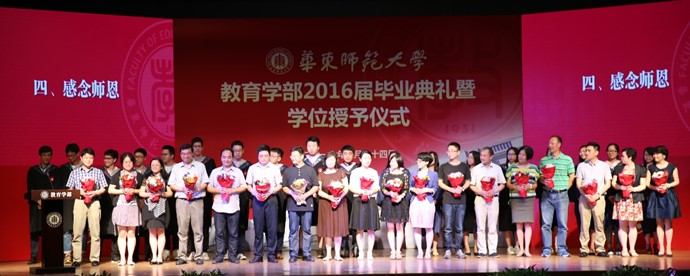 收获的季节也是感恩的季节。教育学部是一个强大的学术和精神共同体,在这个共同体中,有这样一群人一直守护在同学们的身边,在他们的引领和指导下,教育学子获得了一项又一项骄人的成绩。他们就是我们师大”顶天立地”、默默耕耘、无私奉献的老师们。师恩难忘,谁言寸草心,报得三春晖。在这个庄严的时刻,毕业生代表们纷纷上台为自己的恩师献上感恩的花朵和美好的祝福,感谢恩师们在自己的人生道路上予以的无私关怀和悉心教导。