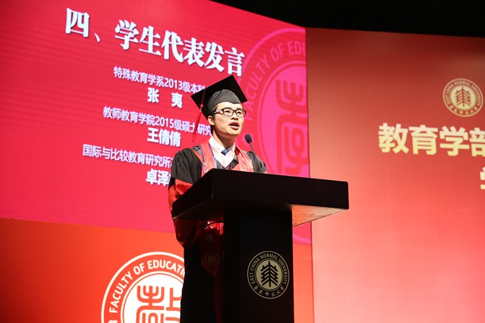 国际与比较教育研究所2014级博士生卓泽林,不仅连续两年荣获博士研究生国家奖学金,而且提前一年完成了博士学业,即将回到故乡的华南师范大学任教。他回忆起求学生涯,认为对他影响最大的就是导师赵中建教授,赵老师是学部一批严谨治学、广育桃李的学者、教师代表,在学习和生活中都是他的榜样和方向。”Work hard,play hard”是卓博士生活状态和性格的写照,他不仅向大家分享了每天阅读文献、关注学术热点等格物致知的习惯和诀窍,还讲到了运动和旅游对于人全面发展的重要性。他喜欢夜跑、健身房”举铁”,既可以锻炼体魄,又可以为增强毅力、愉悦身心;”读万卷书,行万里路”,在周游中探索外面的世界,可以切身感受文化差异,对于专业学习大有裨益。他说:”毕业典礼不是终点,而是起点,’华东师范大学教育学子’是最光荣的身份,这将永远激励我前行。”