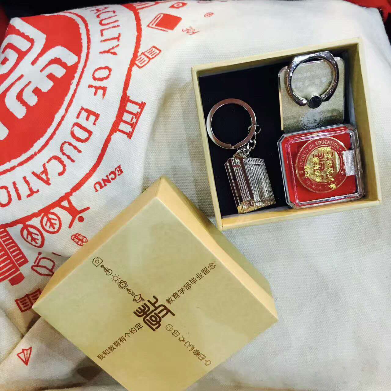 在爱之坪上,教育学部”巨舰式”毕业生合影,象征着教育学子长风破浪的勇气和毅力。毕业典礼的开场视频”在华师大,毕业前一定要做的一件事情”,满是师大和教育学部的记忆;”学位帽”邀请函,背面是逼真的原创师大风景图;专属于毕业生的”三件套”,内有教育学部特制大号部徽、文科大楼模型钥匙扣和印有寄语的手机支架。