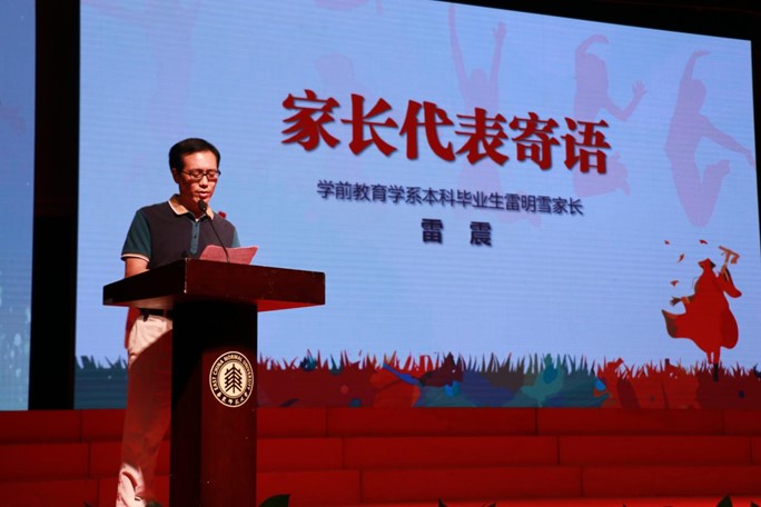 教育学部始终坚持以立德树人为工作中心,重视家校合作,充分凝聚和发挥学校、家庭和社会对学生的教育作用,今年典礼特别增加了家长代表发言的环节。上海市优秀毕业生、学前教育学2014级本科生雷明雪同学的父亲雷震先生作为家长代表发言。