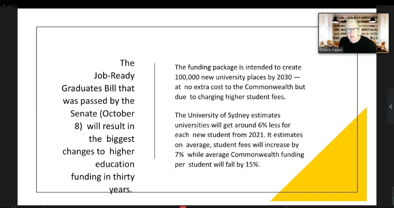 Debra Hayes院长则重点讲述了澳大利亚的教育费用与资助计划,她提到在澳大利亚参议院的就业准备毕业生法案将导致30年来高等教育经费的最大变化,不仅学生自付学费数额将上升,随之而来的学业压力、专业失衡、不正当激励、城乡问题也将逐渐凸显。