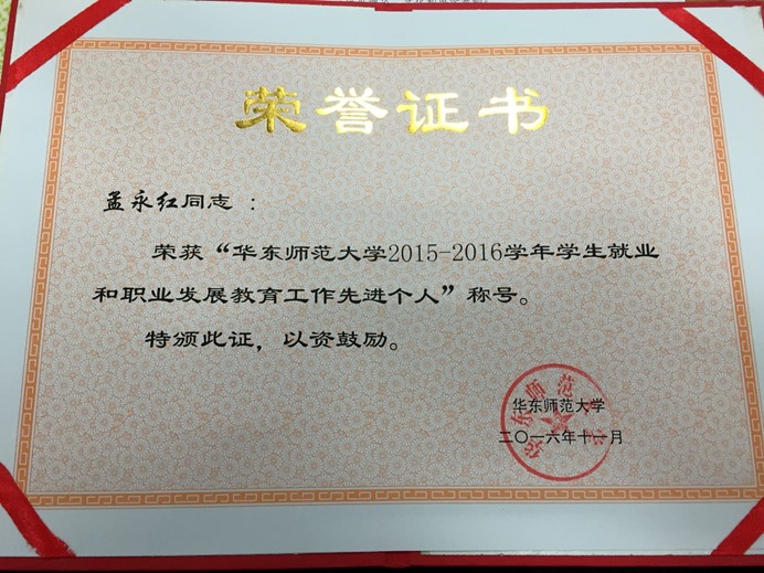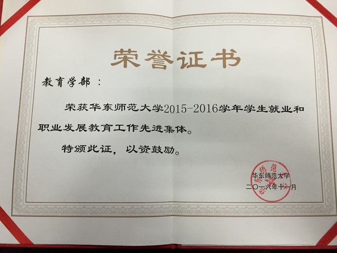 会议宣布,教育学部荣获华东师范大学2015—2016学年学生就业和职业发展教育工作先进集体。教育学部离退休教师事务部主任、研究生辅导员孟永红荣获”华东师范大学2015—2016学年学生就业和职业发展教育工作先进个人”称号。