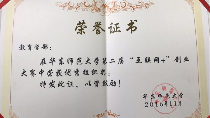 据悉,教育学部在华东师范大学第二届”互联网+”创业大赛中荣获优秀组织奖。