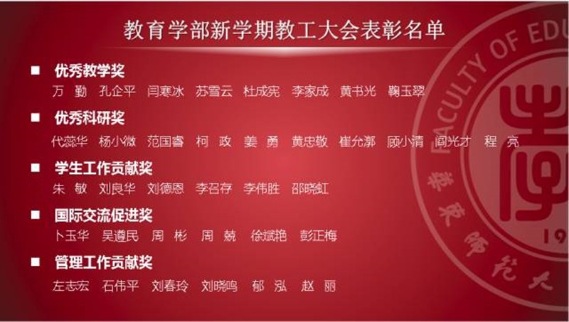 为了表彰过去一年在各个领域表现突出的教职工,教育学部此次特设”优秀教学奖””优秀科研奖”” 学生工作贡献奖”” 国际交流促进奖”” 管理工作贡献奖”五个单项奖。在学部各事务部提名并向各系所领导广泛征求意见的基础上,经学部党政联席会议讨论决定,对万勤等36位教师予以单项奖表彰。五个单项奖的获奖教师先后上台领奖。(完整表彰名单请见文后视频)