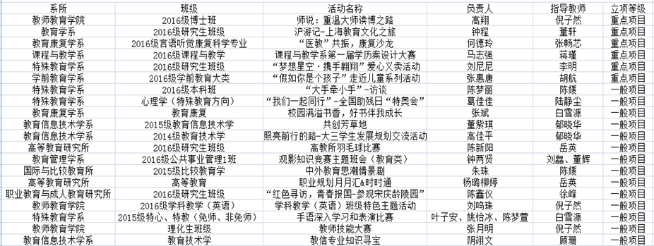 教师教育学院2016级博士生班级通过”师说:重温大师读博之路”活动,加强与博士生导师们的密切交流,请他们为自己指点学术方向、导航人生道路;教育学系2016级研究生班级以”沪游记——上海教育文化之旅”为主题,策划了班级出游、参观名人故居等活动,旨在透过一座城,纵观百年教育发展,体验上海独特的教育历史文化;教育康复学系言语听觉科学专业”‘医教’共振,康复沙龙”主题活动,组织同学们参访中医药博物馆,寓教于乐、知行合一,体现出探索学科领域、加强专业素养的热情和精神;学前教育学系2016级学前教育大类拟开展”‘假如你是个孩子’走近儿童系列活动”,感受学前儿童生活、加深对教学对象的了解,向一线学前教育从业者取经寻宝,并以创作儿童绘本的形式提高专业学习水平。
