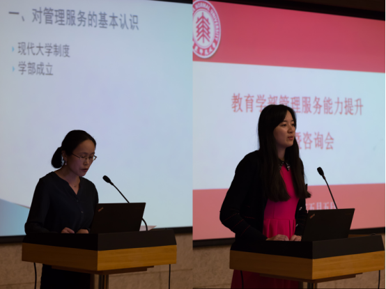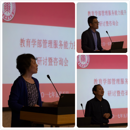 会议分为管理服务能力提升研讨会和咨询会两个阶段。第一阶段由教育学部副主任李政涛主持。汪海萍代表学部首先向学校领导、职能部门以及院系负责人的到会表示欢迎,介绍了学部立足全面提升人才培养能力和双一流建设,在提升管理服务能力方面的初步探索。包括按照现代大学制度建设要求和学部事业发展需要,建立健全学部党、政、学术、群团组织设置,为有效承接学校管理重心下移的权责提供组织与制度保障;根据学部组织架构确定各部门职能和工作规范,依据部门职能定岗定编定责定人,以促进各责任主体主动担责,各展其能;通过加强团队建设和流程梳理建立各责任主体间的协同机制,以提高工作合力和管理效率;针对学部管理服务工作的重点难点问题设立专项研究课题,提高了团队研究管理服务工作的自觉意识与能力;并分享了学部加强民主与高效管理、行政权力与学术权力的协调以及管理服务文化建设等方面的思考。
