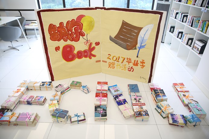 “2017,向您看齐”活动为毕业生与亲爱的袁振国主任单独合影留念提供机会,合照背景板有3D效果图,还有美艺协会学弟学妹们为毕业生手绘的创意展板;”2017,缺你BOOK”收集到毕业生赠给2017级新生的300余本书,以及分享求学感悟的100张祝福卡片。