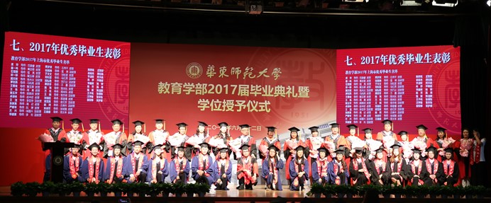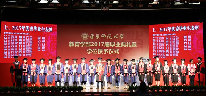 在836名教育学部毕业生中,获评”上海市优秀毕业生”的有49人、”华东师范大学优秀毕业生”55人。学部主任袁振国、党委书记汪海萍依次为他们颁奖,并致以最诚挚的祝福,鼓励他们百尺竿头、更进一步,在日后的逐梦之旅中坚持不懈、持续奋斗,收获更多成就。