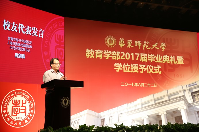 教育学部主任袁振国教授,学部党委书记汪海萍教授,校友代表、高等教育研究所1998届校友、上海市委统战部副部长、市民宗委党组书记房剑森学长,学部学位评定委员会主任委员丁钢教授,学部师资队伍建设委员会主任委员石伟平教授,学部副主任黄瑾、李政涛教授,学部各事务部主任、各系所领导、学位评定委员会委员、教师代表等共同出席并见证了毕业典礼。典礼由学部党委副书记韩春红副教授主持。