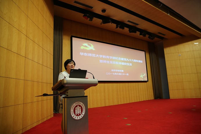 万明霞宣读了《教育学部党委关于表彰2016-2017年度优秀共产党员、优秀党务工作者、先进基层党组织的决定》,经各基层党组织推荐、学部党委组织评选,决定授予闫寒冰等27名同志”华东师范大学教育学部优秀共产党员”称号;授予梅剑等7名同志”华东师范大学教育学部优秀党务工作者”称号;授予教育学部机关第一党支部等8个基层党组织”华东师范大学教育学部先进基层党组织”称号。