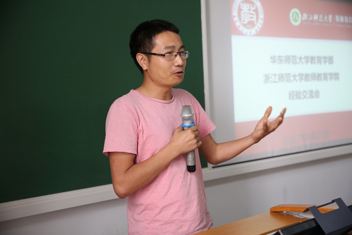 杨光富老师首先致欢迎辞。杨老师代表华东师范大学教育学部学生事务部对浙师大师生们的到来表示欢迎,并就教育学部的发展历史、”五个一百”人才培养计划进行重点介绍。华东师范大学教育学部依托上海市高峰学科建设和教育公平协同创新中心,整合校内教育科学力量,创新人才培养模式,提出并实施”五个一百”计划。通过以立德树人为根本,以社会主义价值体系为核心,培养人文底蕴深厚、专业能力娴熟、责任意识强烈、具有国际对话能力的复合型人才。杨雪龙老师代表浙师大教师教育学院向华东师大教育学部的热情接待和大力支持表示衷心感谢。