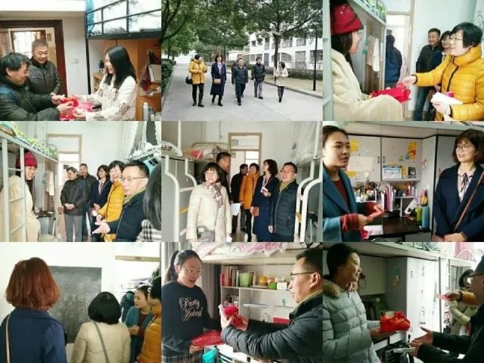 上午10点,学院开展寝室迎新评比,学院党总支书记万明霞老师、院长周彬老师、副院长汪晓勤老师、副书记兼副院长蒋瑾老师、院长助理占小红老师、2017级辅导员孙刘海老师一行在2017级周佳同学的陪同下走访了学院所有留校同学寝室,与大家亲切交谈,对同学们营造的温馨环境表示赞赏,并向每一位留校同学分发了春联,窗花和小狗布偶等新年礼物,送上新春的祝福。