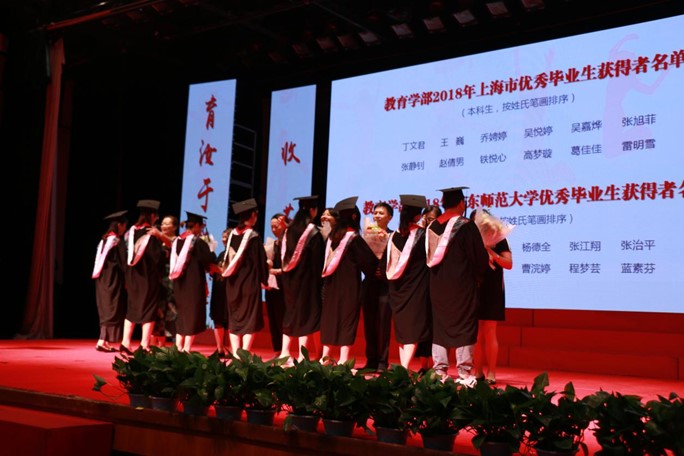 在聆听教诲和祝福之后,毕业生们用行动诠释”传承”。今年,学部共有78名毕业生分别荣获”上海市优秀毕业生”和”华东师范大学优秀毕业生”荣誉称号。典礼上,一改传统的表彰形式,20名市优毕研究生代表、12名校优毕本科生代表,分别依次用鲜花和拥抱向教师代表和家长代表表示诚挚的感恩之情。之后,在这个与稚嫩的自己告别的日子里,全场毕业生起立向恩师和家长行鞠躬礼。这既是对过往的感谢,也是对未来的承诺。