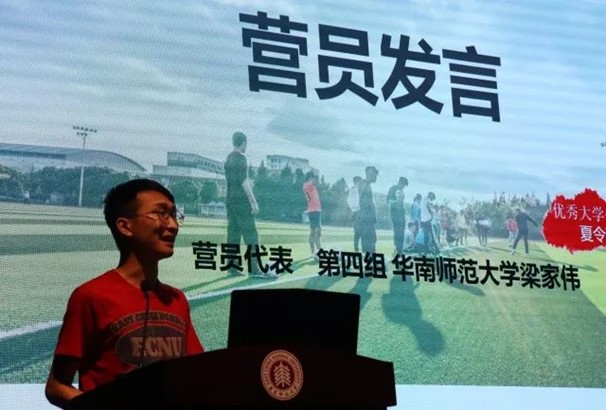来自华南师范大学的梁家伟同学作为本届营员代表发言。梁同学提到”我们教育学子不仅仅要拥有先进的、跨越当下的教育视野,更要肩负起培育下一代的使命。”参加夏令营活动后,他真切体会到了华东师大教育学部在人才培养上的”用心””用力””用情”,进一步明确了自己忠于教育事业的初心。
