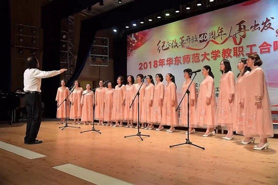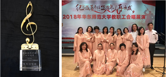 为庆祝我国改革开放四十周年,华东师范大学校工会于11月21日在闵行校区音乐厅举办了以“献身科教兴国,共筑中国梦想”为主题的“2018年华东师范大学教工合唱展演会”活动。来自全校13个部门工会近三百名教职工参加了展演。教育学部音社合唱团在工会主席王莉老师的鼓励和筹备下,派出了16位老师参加了此次比赛。在参赛中老师们引吭高歌,声情并茂,脱颖而出,最终以合唱曲《送别》和《青春舞曲》得到了评委老师和观众们的一致好评!一举荣获大赛的金奖——优秀演唱奖。