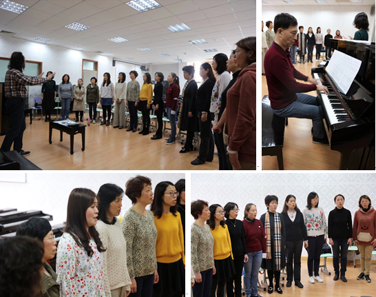此次参赛队伍由艺术教育部蒋新俭老师担任合唱指挥,成纲老师担任伴奏,参赛老师来自各系部。在得到比赛通知的第一时间里,主席王莉老师和工会组长王海东老师就协助音社统筹参赛人员,音社的合唱指导蒋新俭老师和团长周蓓老师一起对曲目的选择和声部的分配做了恰当的安排。音社老队员郁泓老师、冯民老师、张晔老师等在服装、用餐、用车等后勤保障上给予了大力支持。艺术教育部的董放老师、鲁云斐老师、张馨老师和程征老师积极加入并协助指导。在比赛筹备的过程中,老师们克服各种困难挤出时间全身心投入排练。其中有老队员严敏老师、章佳颖老师、蔡尚芝老师、谷秀蓉老师,还有新队员李玉华老师、江琴娣老师、李红艳老师和张畅芯老师。大家一起群策群力对合唱的质量和舞台的效果出谋划策,力争用最佳的演唱水平为学部争光。